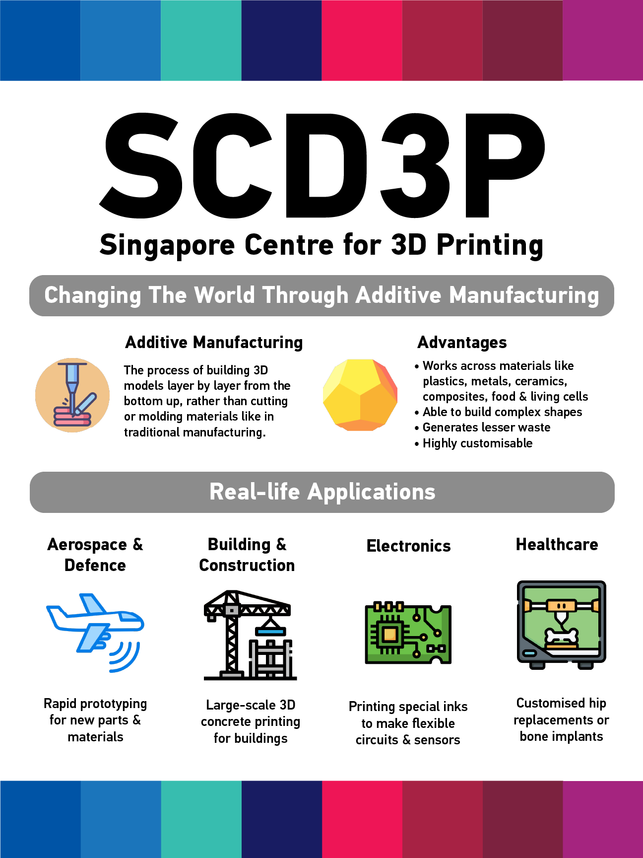 Singapore Centre for 3D Printing ![]() | The Singapore Centre for 3D Printing (SC3DP) commenced in December 2014. The Centre is funded by National Research Foundation (NRF), and supported by Nanyang Technological University, Singapore (NTU, Singapore), Economic Development Board (EDB) and external industry partners. SC3DP aims to become a world leader in 3D Printing and a wellspring of knowledge by attracting leading researchers to the centre and nurturing a skilled talent pool, establishing strong linkages with and delivering state of the art and innovative solutions to the industry. |