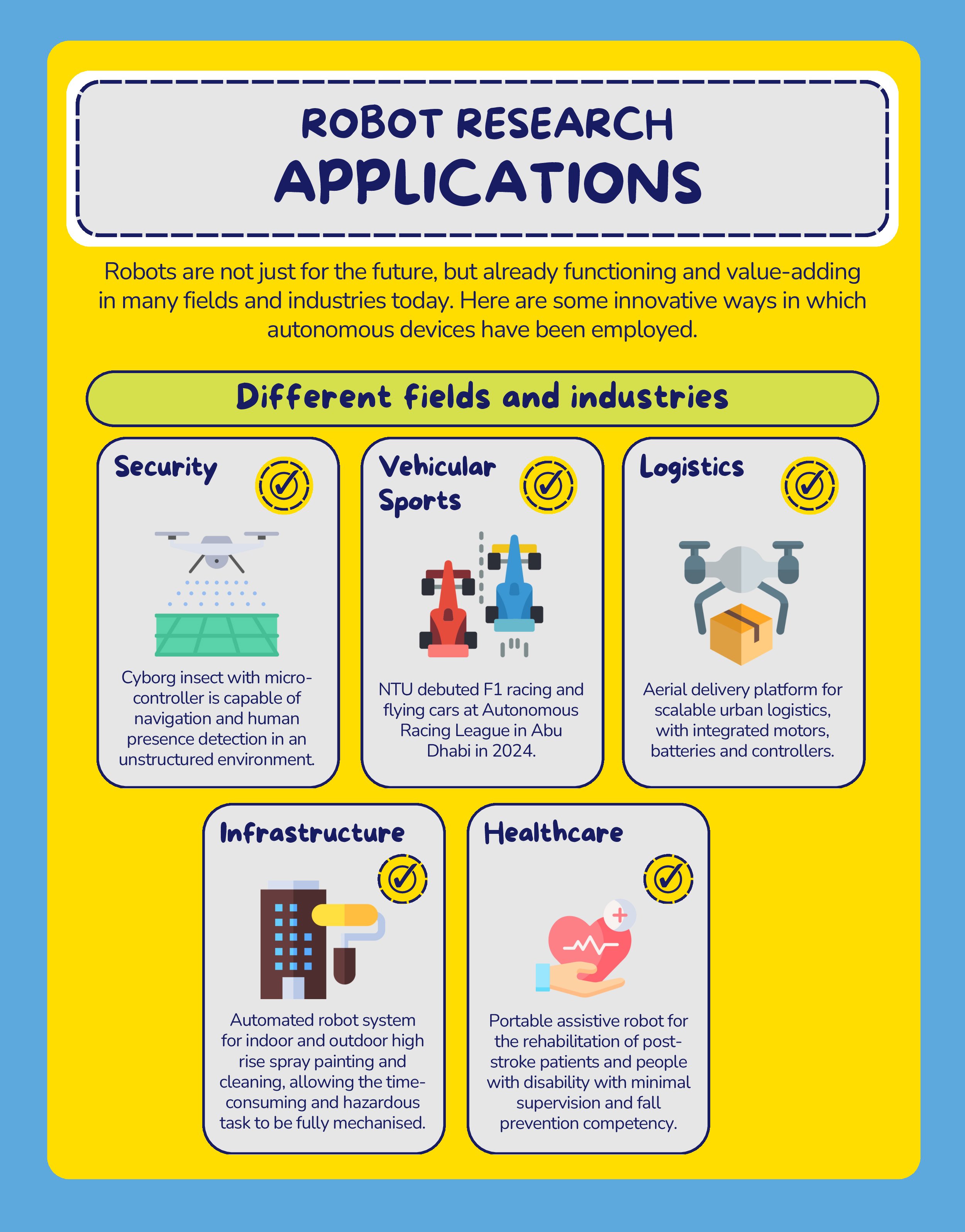 Robotics Research Centre (RRC) | The Robotics Research Centre (RRC) was established in 1994 as a university centre with MAE, EEE and SCE as participating schools. It is the first interdisciplinary research centre on robotics in Singapore. The interdisciplinary nature of robotics makes it a disruptive enabler for promoting productivity leading to economic growth, for ensuring sustainability of complex urban environments, for the urgent healthcare needs in an ageing society, as well as for safety and security worldwide. |