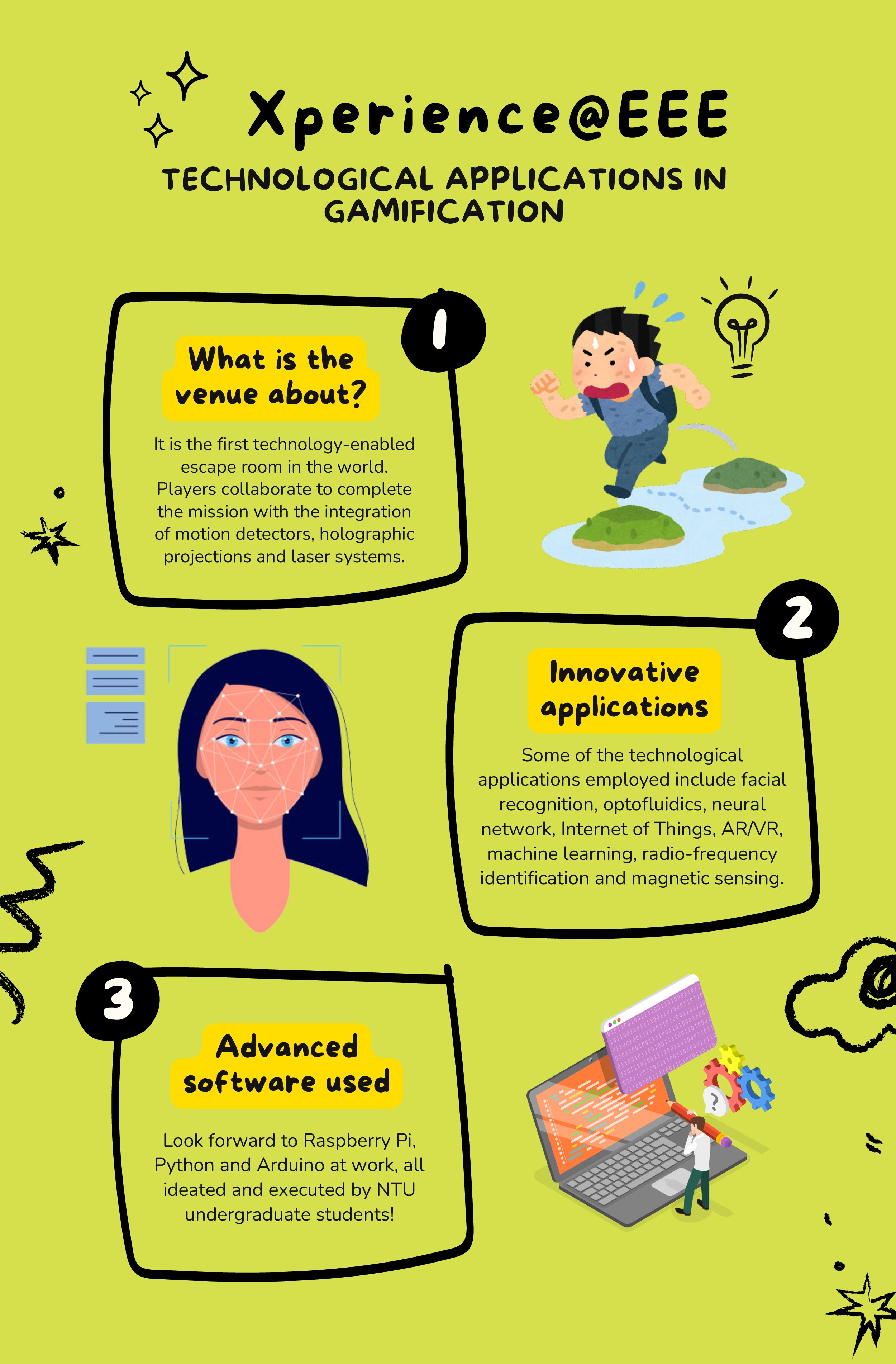 Xperience@EEE ![]() | Xperience@EEE is a pioneering, technology-enabled escape room built entirely by undergraduates from Nanyang Technological University’s School of Electrical and Electronic Engineering. Recognised as the first of its kind worldwide, it challenges participants to collaborate and solve puzzles using wit and creativity. Advanced features such as motion detectors, holographic projections and laser systems deliver a unique blend of engineering ingenuity and immersive gameplay. |
