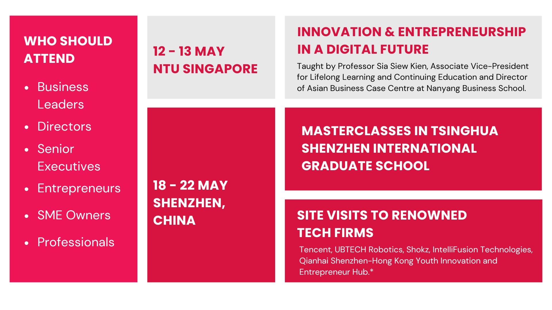 Learners will acquire knowledge and skills in go-to-market strategies and networking in China. They will cultivate a proactive mindset and readiness for China's evolving business landscape. Through seminars, meetings with senior executives, and visits to leading companies, learners will gain firsthand insights into China’s innovation frontier.