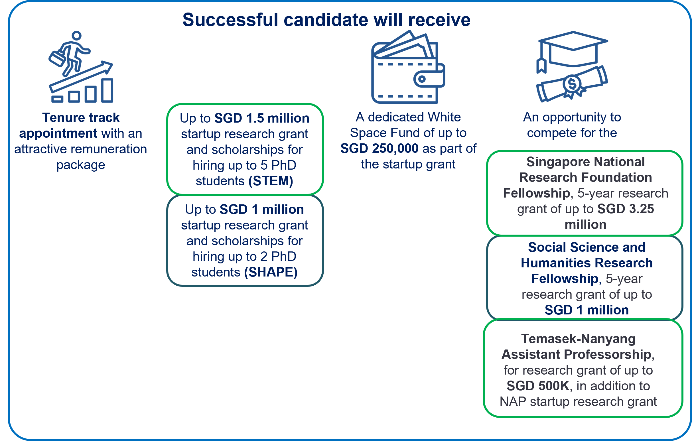 - Eligibility extends to both new external applicants and NTU Faculty (not holding the rank of Associate Professor or Professor) who have joined within the last 12 months or within 3 years after PhD, whichever comes later. Existing NTU Faculty are limited to a single application attempt.
