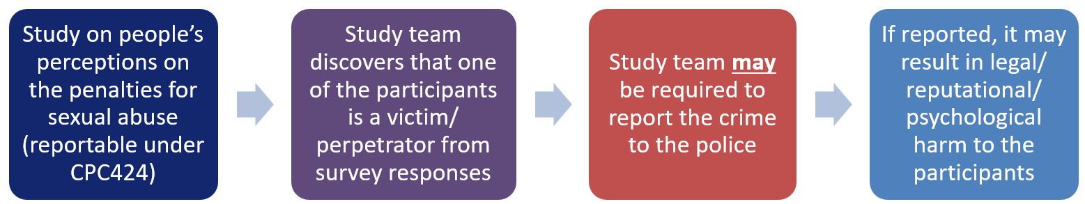 During the course of research, a study team may obtain information from participants indicating that they were involved in a crime. The likelihood of this happening depends on the research objectives and the study design.
