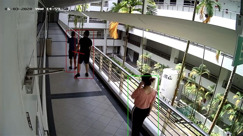 The social distancing analyzer in the ROSE pandemic management system can automatically analyze the distance between people. When people are too close to each other, it will automatically trigger an alarm. Figure 2 shows the analyzer can detect people which are close to each other (red bounding boxes) and also differentiate people who keep a reasonable distance to others (green bounding box). Deploying it on current surveillance systems and drones to monitor large areas can help to prevent the spread of the coronavirus by allowing automated and better tracking of activities happening in the area. The analyzer provides analytics of the area in real time. It can also be used to alert security personnel in case of considerable violation of social distancing protocols in a particular area.