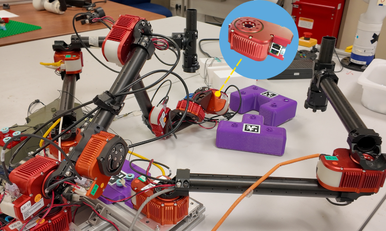 Kinova robotic arms with 7 degrees of freedom, labelled with blue sensors for motion capture