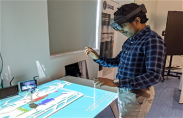 Air Traffic Controller engaging with mixed reality interface and 3D printed airport infrastructure model.