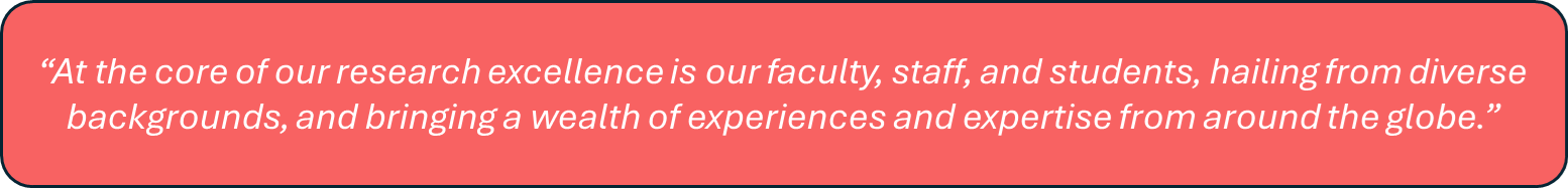 At the core of our research excellence is our faculty, staff, and students, hailing from diverse backgrounds, and bringing a wealth of experiences and expertise from around the globe. Cultural richness not only enhances our learning environment but also promotes collaboration and innovation across disciplines. The faculty members share a common passion for discovering solutions to some of the world’s most pressing challenges.