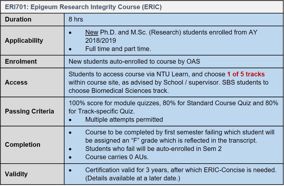 ERI701 is a research integrity course with 0 AUs applicable to new Ph.D. and M.Sc. (Research) students who join NTU from AY2018/19. Existing graduate research students will continue to complete ERIC prior to QE following current schools’ processes.