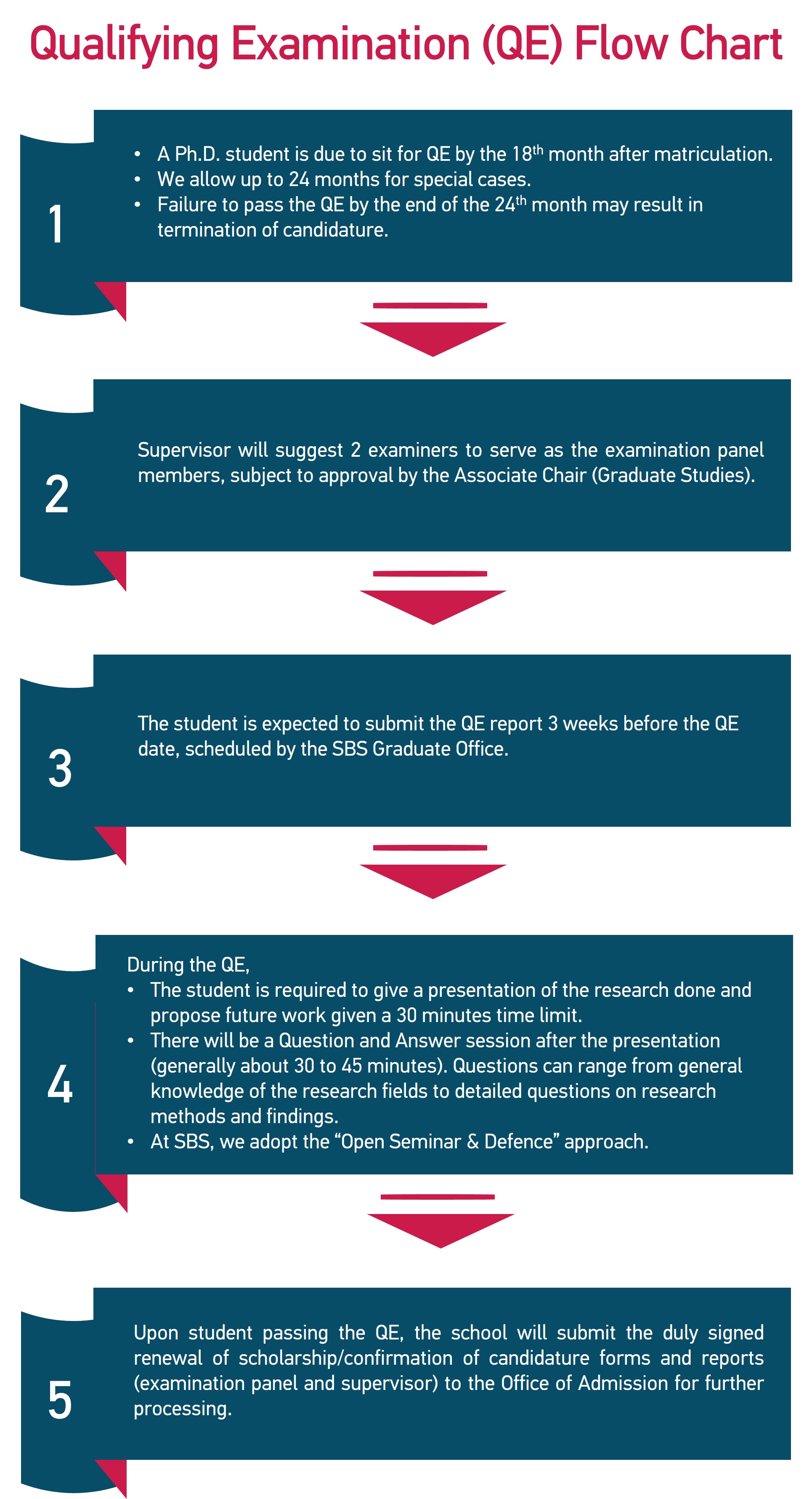 - Every PhD student has to pass the QE which is arranged and conducted by the respective Schools typically at around 18th month, but not exceeding 24th month from the commencement of the student’s PhD candidature. The timing of the Qualifying Examination may be initiated by the supervisor or by the School. Note: The student needs to achieve a cGPA of 3.5 and above before he/she can proceed to sit for the QE.