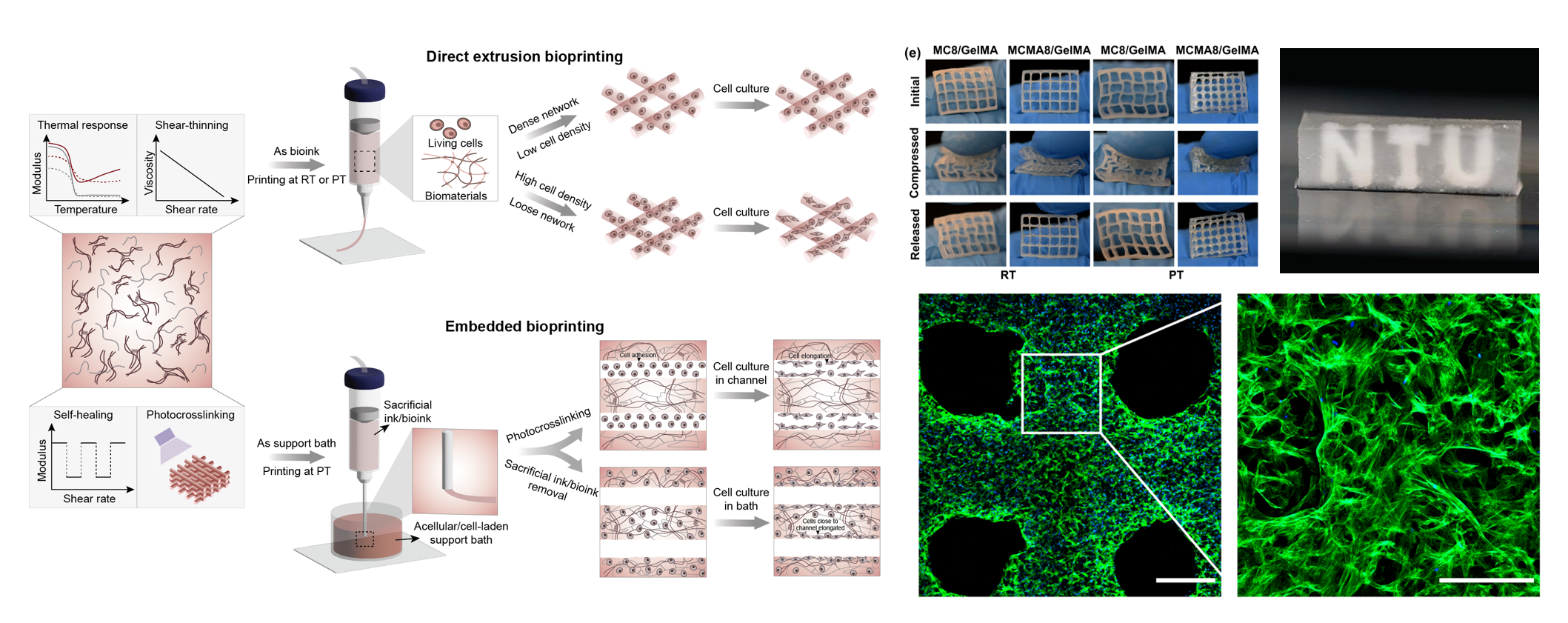This study reports a dual thermoresponsive and photocrosslinkable GelMA-methylcellulose platform designed to enable both direct extrusion and embedded 3D bioprinting at physiological temperature (37 °C). This addresses a common trade-off where bioinks become low-viscosity (cell-friendly) but lose print fidelity at 37°C. Combining GelMA with MC or MCMA creates a semi-interpenetrating/interconnected network whose temperature-dependent rheology (gel-sol-gel) provides extrusion-friendly shear-thinning plus self-healing support-bath behaviour at a broad range of temperatures, and then “locks in” structure via photocrosslinking.