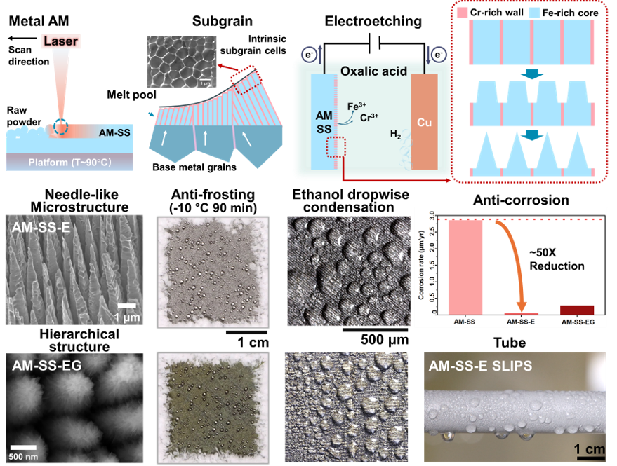 A scalable electrochemical strategy is developed to form hierarchical micro/nanostructures on AM SS316L with ultra-low droplet adhesion. Mechanistic insights into oxalic-acid electroetching show that optimized conditions generate dense needle-like microstructures, while FeO(OH) nanosheets further construct robust hierarchical structures. The resulting surfaces achieve ~50× corrosion-rate reduction, delay frosting to -15°C, and stable dropwise condensation of low-surface-tension fluids, demonstrating multifunctionality for advanced AM-enabled thermal and interfacial applications.