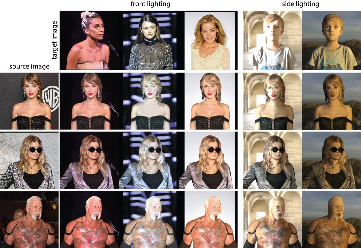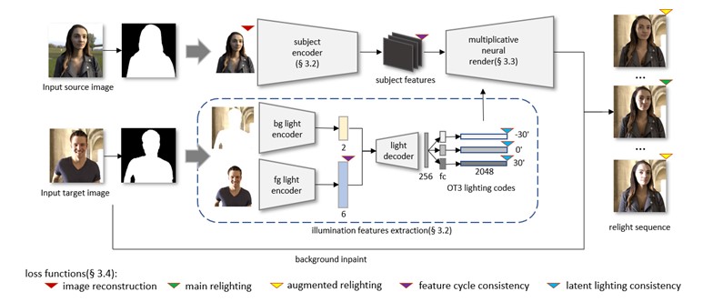 - For encoding the lighting in the target reference image, we use separated foreground and background lighting encoders. The reason is that in a portrait image, the appearance of the subject is mainly modulated by the foreground lighting, i.e., the illumination behind the camera, but is hard to estimate. The background has a secondary role, but may provide correlation cues to help determine the foreground lighting. These two encoders have different channel sizes to reflect different significance. This leads to improved results as compared to encoding the entire image, which is the typical approach.