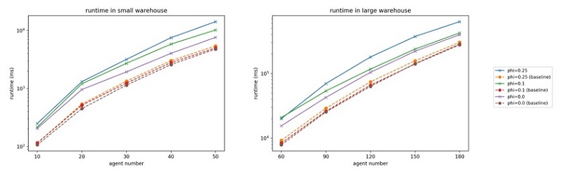 In the baseline algorithm, which is in dashed lines, we skip the agent selection phase and select the agent with the minimum flexibility directly. It can be observed that our framework has an improvement in the success ratio of tasks meeting deadlines in both warehouses compared to the baseline algorithm.