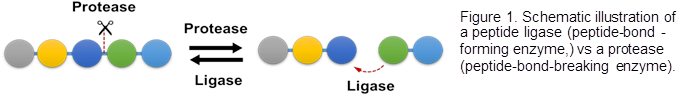 Enzymes, which catalyze >5,000 types of reactions, are bio-transformers and engines of life. They are also enabling tools for research and useful commodities for industrial applications. Proteases, enzymes which break peptide bonds, are ubiquitous, with >400,000 found in databases and >4200 characterized. In contrast, peptide or protein ligases, peptide-bond-forming enzymes, which catalyze the reverse reactions of proteases are poorly characterized (Figure 1). Many are ATP-dependent and exist as protein complexes. Consequently, they are not applicable for biochemical uses in cell-free systems. Stand-alone and “ATP-independent” peptide ligases are the enzymes that would be highly useful for in-vitro biochemical reactions, but they are exceedingly rare. Thus far, only a few such ligases have been characterized. Hence, the discovery and the ability to engineer “ATP-independent peptide ligases” offer many exciting new possibilities and an open-ended research program to explore new frontiers in science and engineering.
