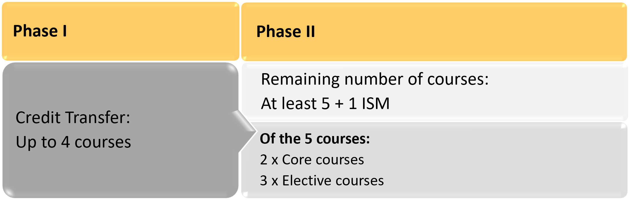 The Master of Science (with a specialisation) programme allows for a credit transfer of up to 4 courses selected from the 4 CE Master's courses (LC, LDO, ADSP, EST) completed up to NTU's accreditation requirement in Phase I. To successfully obtain the Master's degree, MSc (Management)/ MSc (Strategy) students are required to complete an additional 2 core courses, 3 electives, and an Independent Study Module in Phase II.