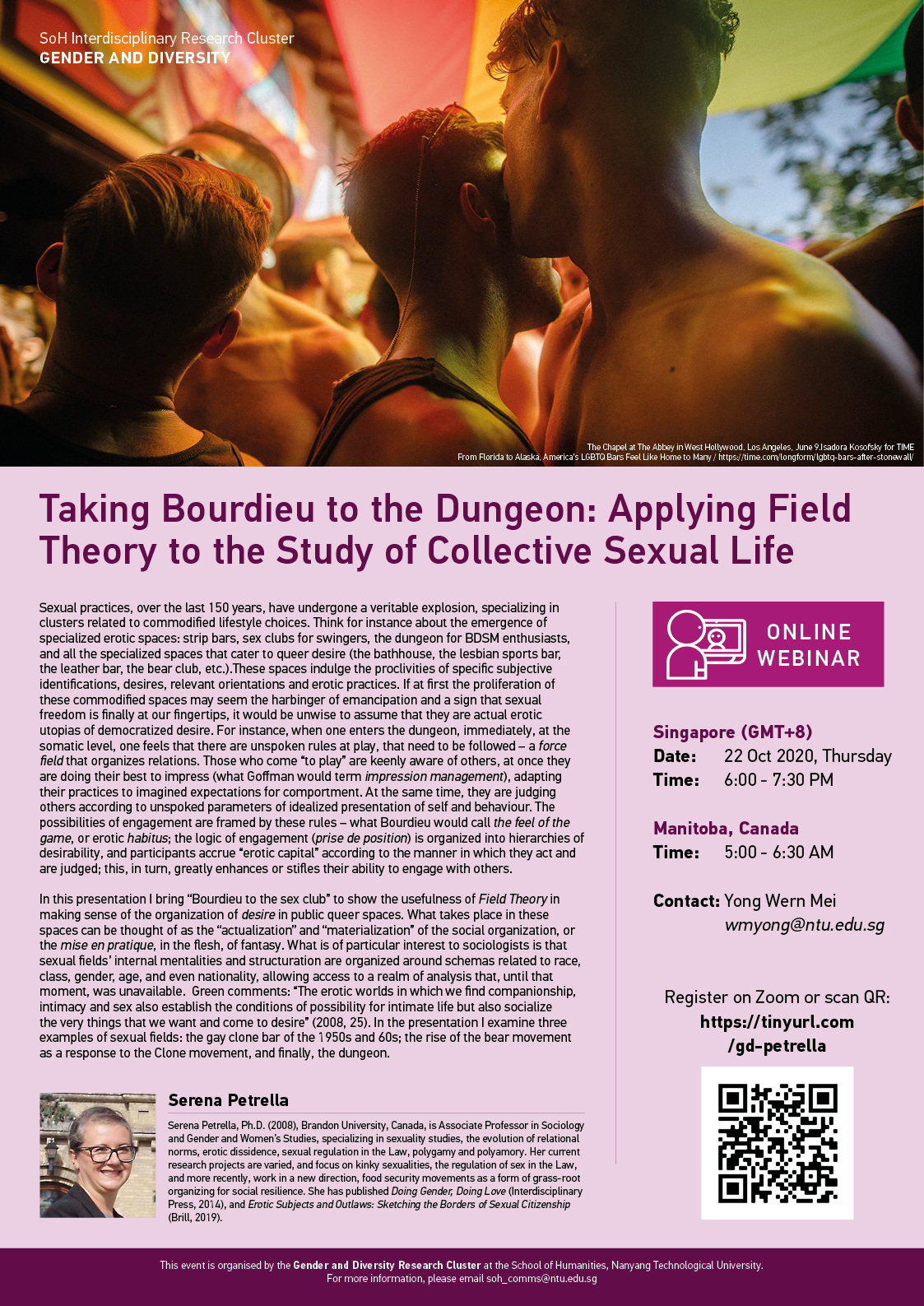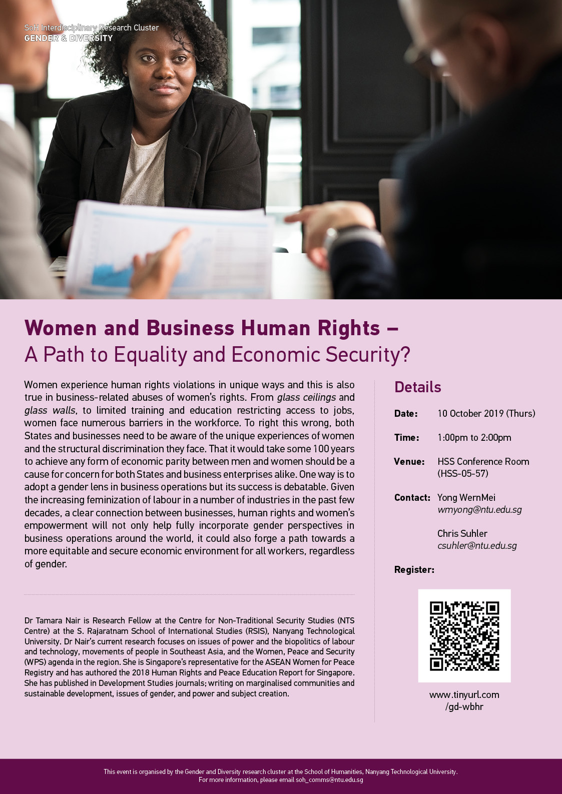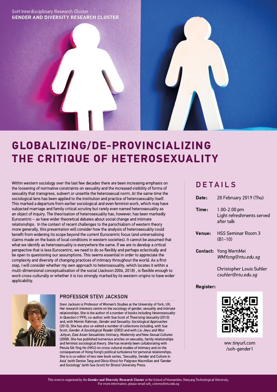 The Gender Studies research cluster taps into the breadth of cross-programme disciplines within the School of Humanities and the School of Social Sciences to establish gender and sexuality as fundamental categories of social and cultural analysis towards studying the diversity of human experience. Drawing on history, literature, language, psychology, philosophy, cultural studies and sociology, this cluster addresses the intersections of gender, sexuality with other dimensions of identity formation, such as class, race, ethnicity, age, nationality and transnational movement.