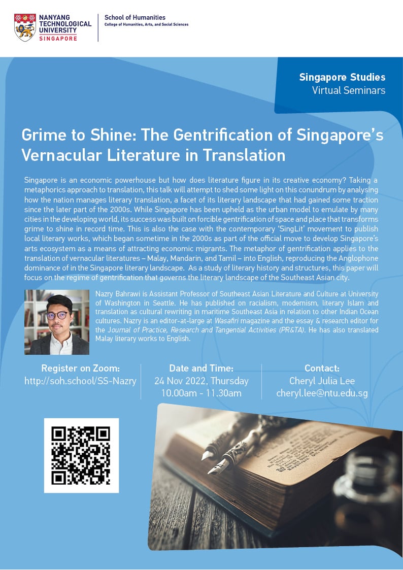 This research cluster brings together scholars from diverse disciplines with a shared interest in Singapore Studies. Through workshops, symposiums, talks, and other projects, we hope to foster a vibrant and supportive context for researchers working in the various areas of literature, linguistics, culture, history, among others. We also seek to forge a regional and international network and welcome ideas for collaboration.