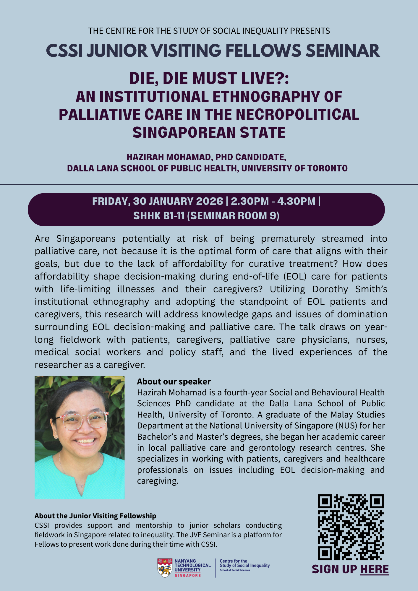 (CSSI Junior Visiting Fellows Seminar) Die, die must live?: An Institutional Ethnography of Palliative Care in the Necropolitical Singaporean State