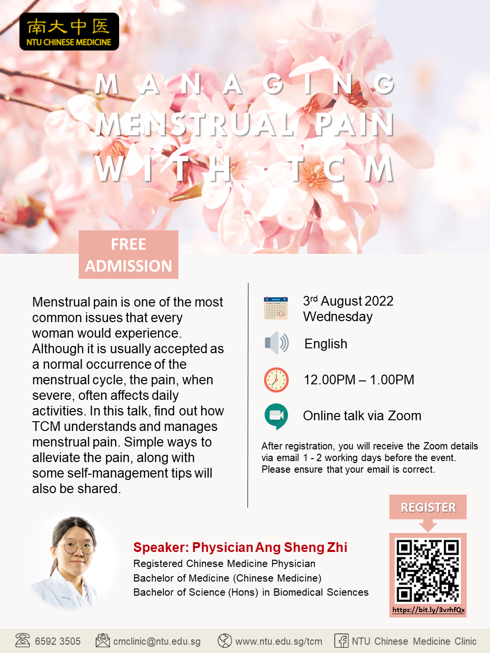 Menstrual pain is one of the most common issues that every woman would experience. Although it is usually accepted as a normal occurrence of the menstrual cycle, the pain, when severe, often affects daily activities. In this talk, find out how TCM understands and manages menstrual pain. Simple ways to alleviate the pain, along with some self-management tips will also be shared.