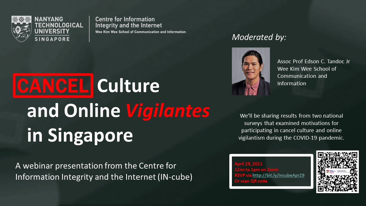 The Centre for Information Integrity and the Internet (IN-cube) invites you to join a webinar exploring cancel culture in Singapore as well as online vigilantism during the COVID-19 pandemic. The presentations will share data from two national online surveys conducted in Singapore last year.