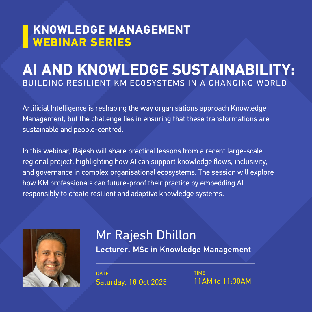 The Wee Kim Wee School of Communication and Information, Nanyang Technological University, invites you to the next instalments of our KM Webinar Series — a lineup of short, impactful sessions spotlighting emerging trends and practices at the intersection of Knowledge Management (KM) and Artificial Intelligence (AI).