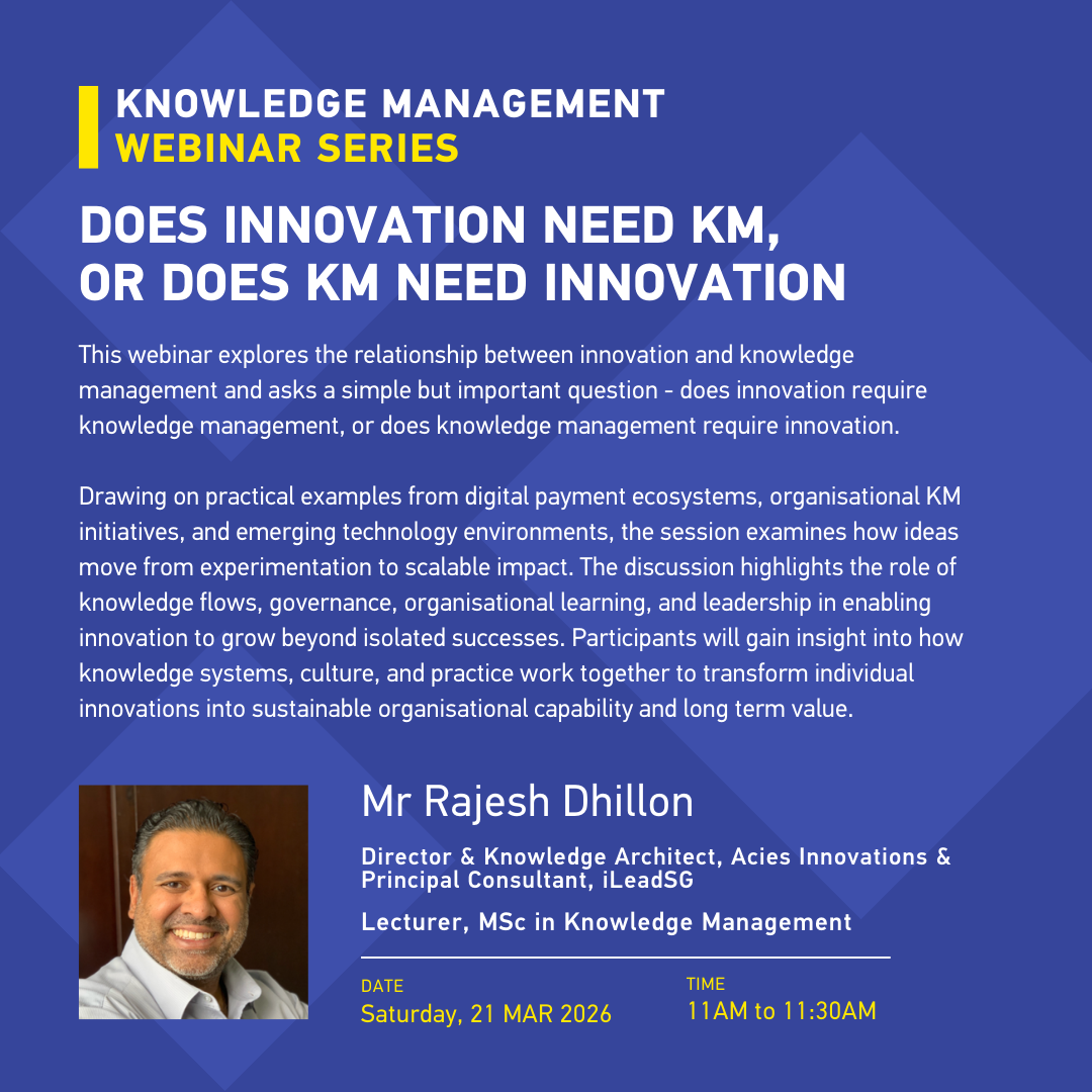 The Wee Kim Wee School of Communication and Information, Nanyang Technological University, invites you to the next instalments of our KM Webinar Series — a lineup of short, impactful sessions spotlighting emerging trends and practices at the intersection of Knowledge Management (KM) and Artificial Intelligence (AI).